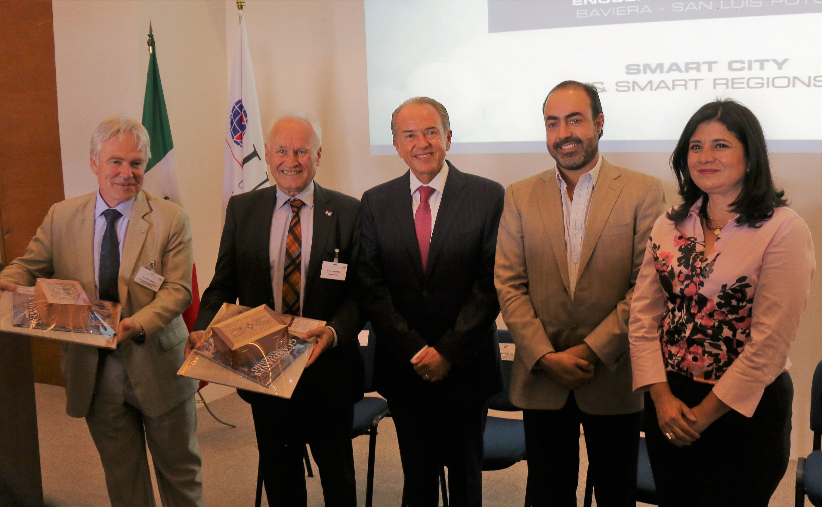 (v.l.n.r.) Christian Weber, State of Bavaria - Mexico Office; Delegationsleiter Erwin Huber (MdL), Staatsminister a.D.; Juan Manuel Carreras Lopez, Ministerpräsident San Luis Potosí; Gustavo Puente Orozco, Wirtschaftsminister San Luis Potosí; Norma Morena, Direktorin Universität UNID, San Luis Potosí