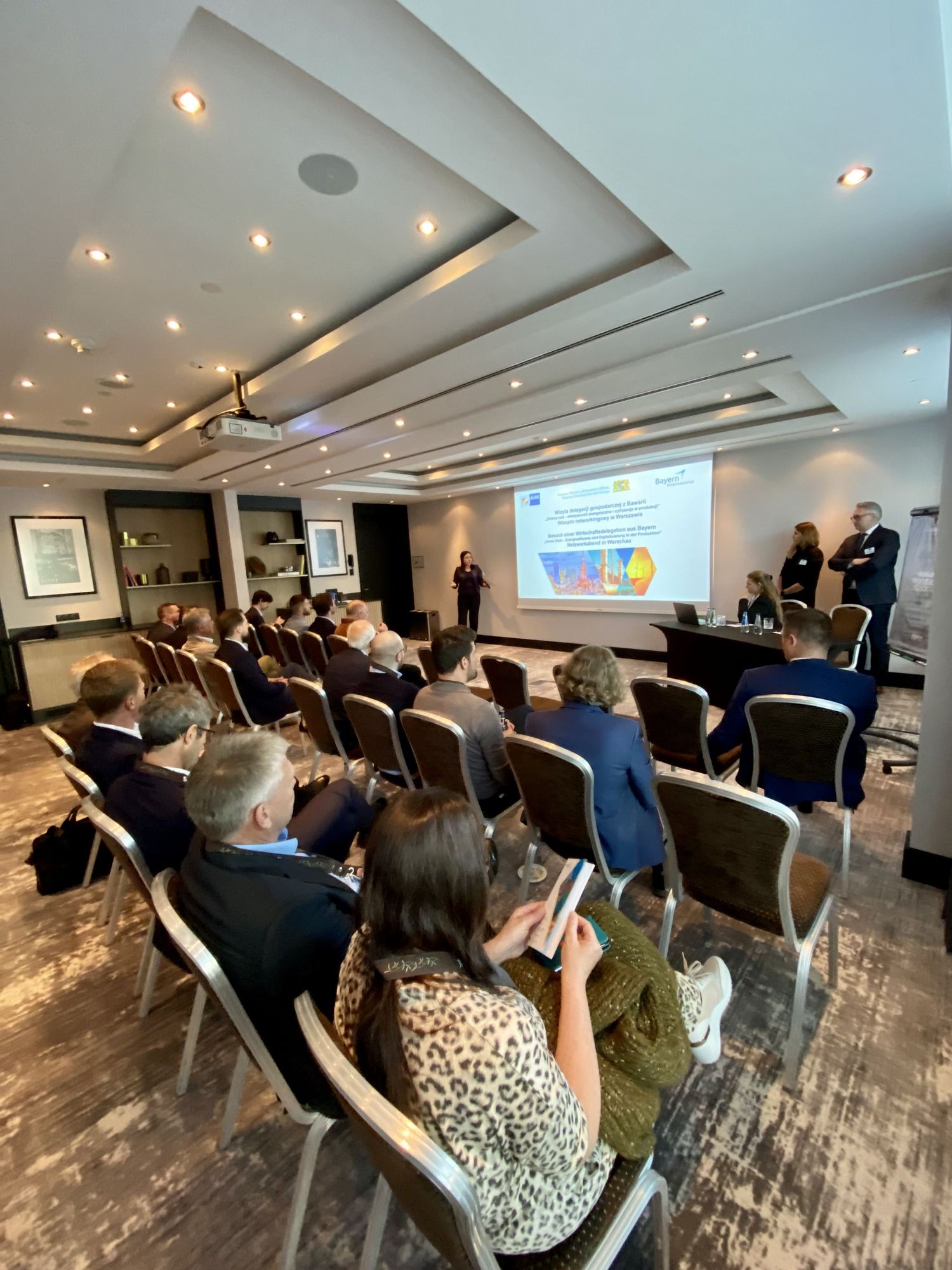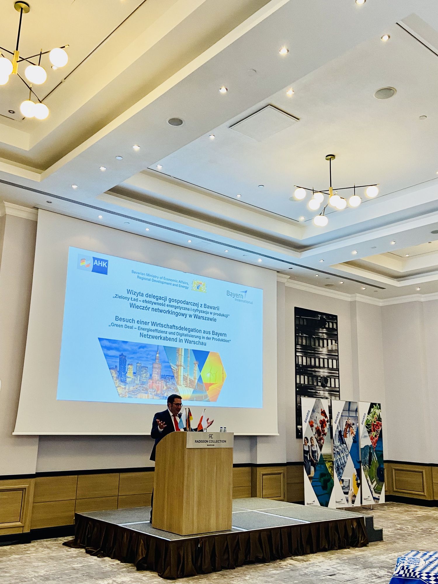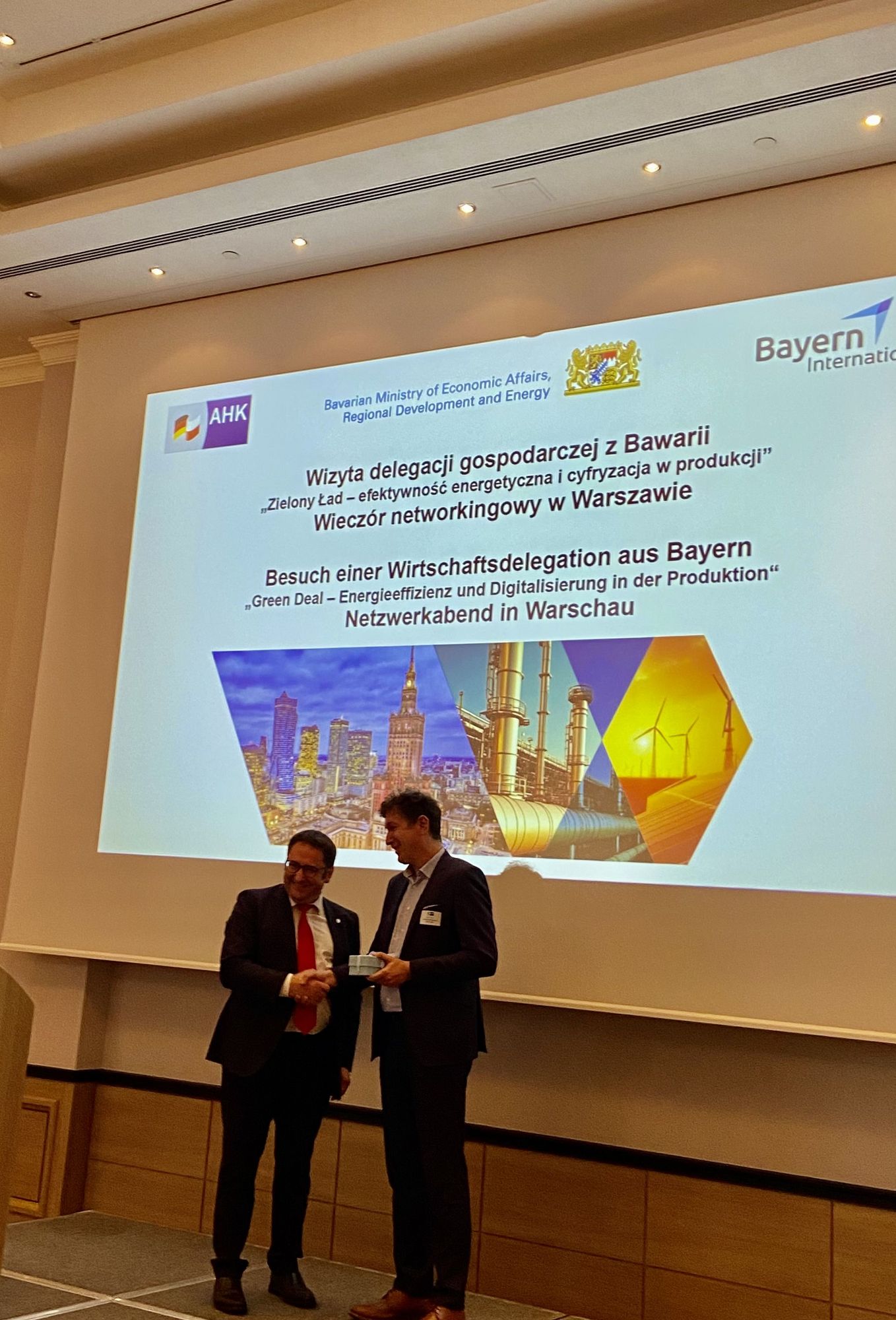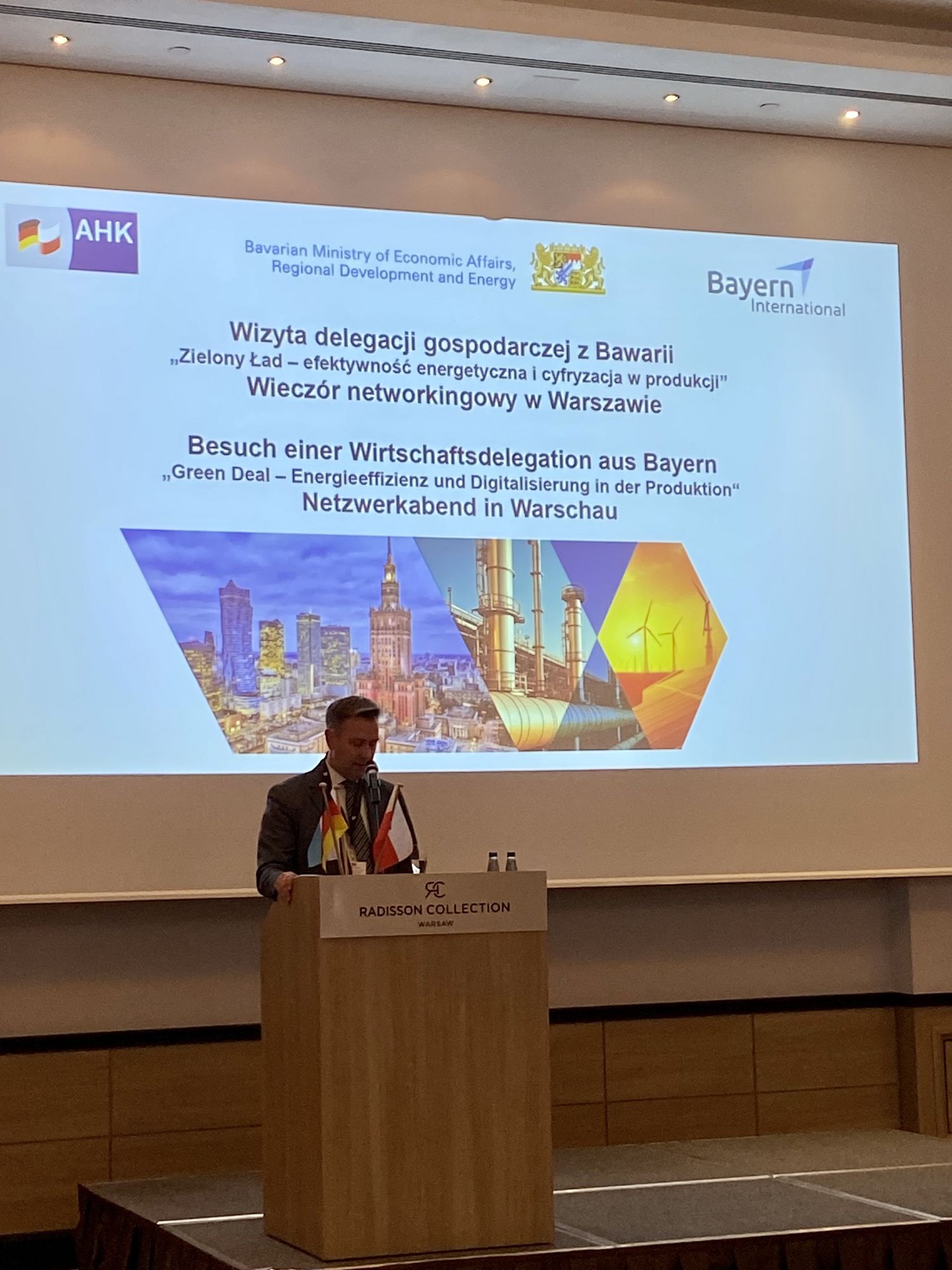Unter dem Motto „Green Deal: Energieeffizienz und Digitalisierung in der Produktion“ reiste daher eine hochrangig besetzte Delegation aus politischen und wirtschaftlichen Akteuren Bayerns unter der Leitung von Staatssekretär Tobias Gotthardt ins Nachbarland, um Chancen für eine wirtschaftliche und auch politische Zusammenarbeit auszuloten. Die Reise führte von Warschau über Kattowitz nach Krakau und bot den Teilnehmern neben topaktuellen, fachlichen Briefings zahlreiche Einblicke und Austauschmöglichkeiten: ob bei Firmenbesuchen, bei Branchengesprächen, Pitches, Empfängen oder konkreten Erfahrungsberichten von Firmen, die bereits in Polen ansässig sind. Auch die Teilnahme beim European Economic Congress (EEC) in Kattowitz. Im Fokus standen hier die Geopolitik, Energie, Sicherheit und nachhaltiges Wirtschaften ebenso wie digitale Technologien, Recht vs. Wirtschaft und arbeitsmarktpolitische Themen. Staatssekretär Tobias Gotthardt erhielt die Gelegenheit zu einem Auftritt in einem Panel zum Thema Industrie 4.0.