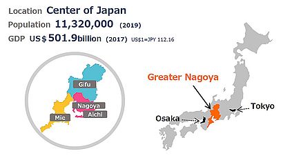 Greater Nagoya bezieht sich auf die Wirtschaftszone im Umkreis von 100 km von Nagoya City und ist eine der drei größten Metropolregionen Japans. Sie umfasst die meisten der Präfekturen Aichi, Gifu und Mie (siehe Grafik).