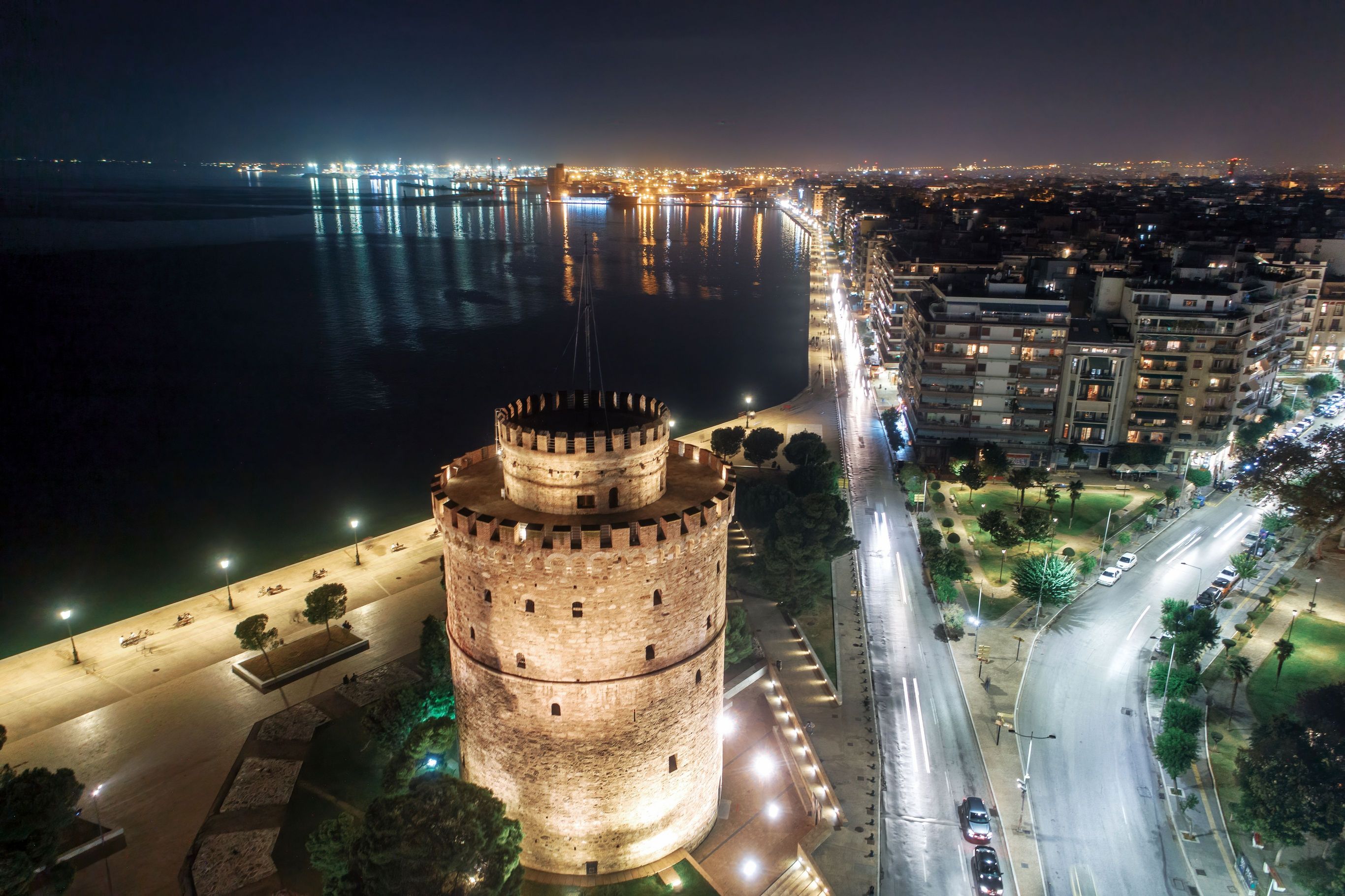 Aerial view of the White Tower square the night, in Thessaloniki, Greece