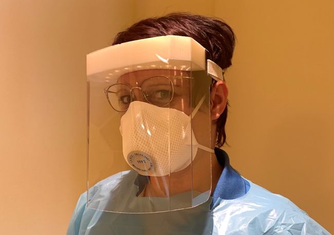 Mitarbeiterin der Kinderarztpraxis Dr. Sperlich in Ampfing mit einem Faceshielt der Firma Wackerbauer (Foto: © Dr. Michael Sperlich)