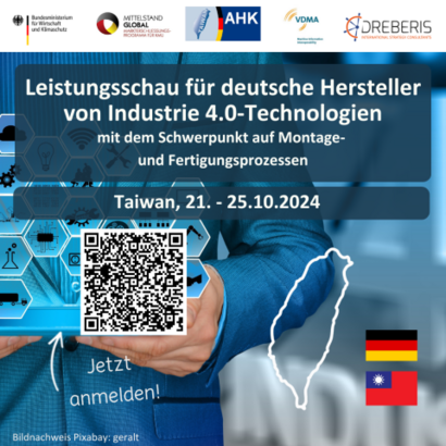 Im Auftrag des Bundesministeriums für Wirtschaft und Klimaschutz (BMWK) führt DEinternational Taiwan Ltd., die Dienstleistungsgesellschaft des deutschen Wirtschaftsbüros Taipei (AHK Taiwan), in Zusammenarbeit mit der DREBERIS GmbH im Zeitraum vom 21.-25.10.2024 eine geförderte Leistungsschau für deutsche Hersteller von Industrie 4.0-Technologien in Taiwan durch. Es handelt sich dabei um eine projektbezogene Fördermaßnahme im Rahmen des Markterschließungsprogramms für KMU.