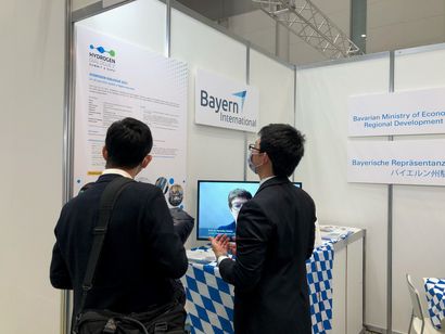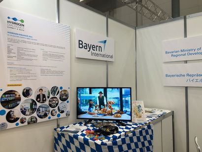 Da der Freistaat aber seit 1988 mit einer eigenen Repräsentanz in Tokio vertreten ist, konnte Bayern International zumindest mit einem Infostand die bayerische Wasserstoff-Kompetenz und -Strategie auf der Messe im Tokioter Messegelände BigSight präsentieren. Die Mitarbeiter der Bayerischen Repräsentanz in Japan unter Leitung von Dr. Christian Geltinger stellten den japanischen Fachbesuchern das bayerische Wasserstoffzentrum H2.Bayern vor und luden zum 2. Hydrogen Dialogue in Nürnberg ein.