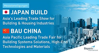 Ihr bayerisches Unternehmen bietet Dienstleistungen, Produkte oder Lösungen im Bereich Bauwirtschaft an? Sie haben Interesse, Ihre Produkte oder Ihr Know-how nach Japan oder China zu exportieren. Dann haben wir zwei passende Messebeteiligungen für Sie im Angebot: Japan Build und BAU China.